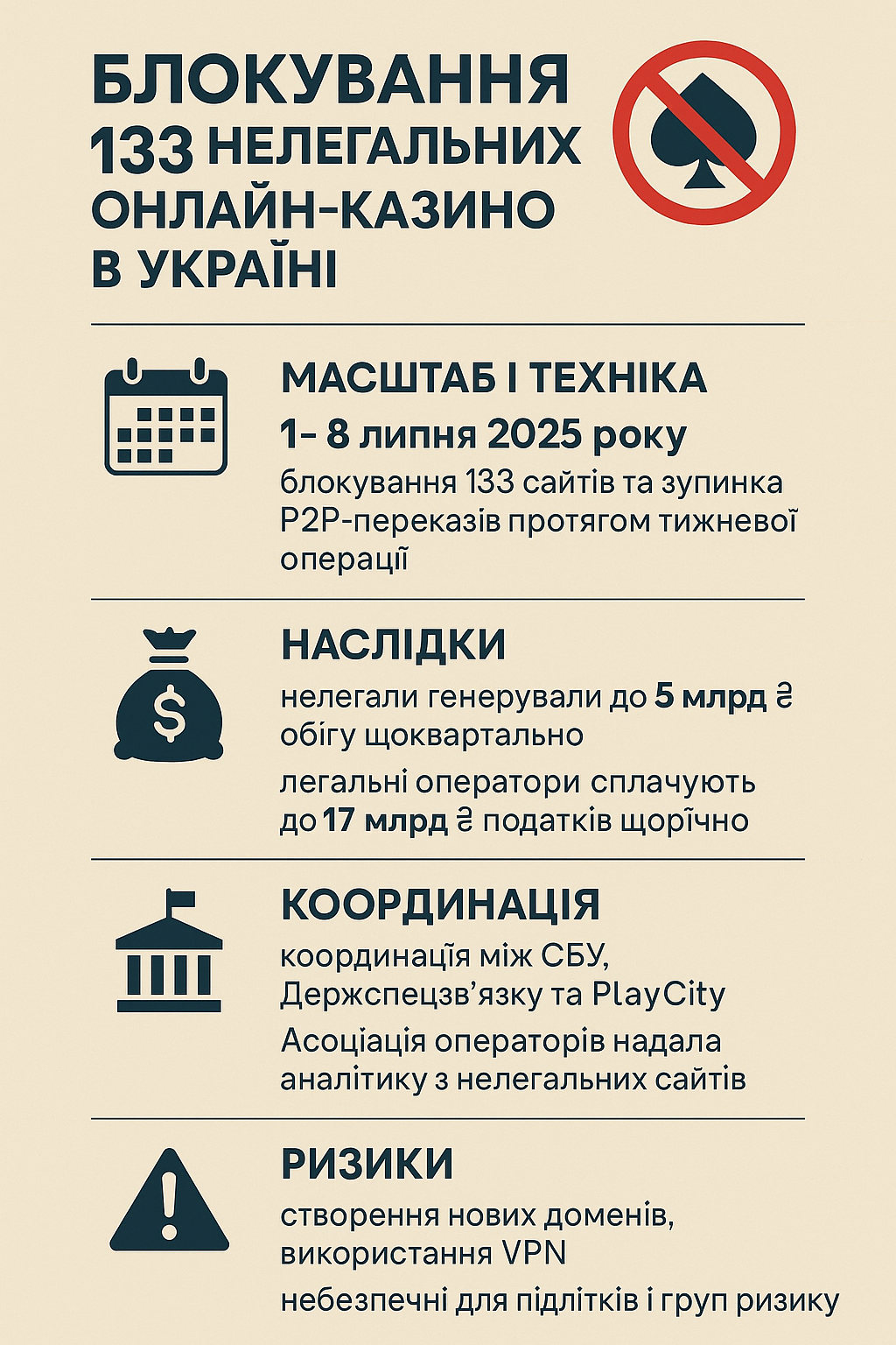 У липні 2025 року Україна здійснила безпрецедентний крок у боротьбі з тіньовим гральним бізнесом — в результаті узгодженої операції було заблоковано 133 нелегальні сайти онлайн-казино. Це стало можливо завдяки координації між Службою безпеки України, Держспецзв’язку, Національною комісією з електронних комунікацій (НКЕК), новоствореним регулятором азартного ринку PlayCity та профільною Асоціацією легальних операторів.